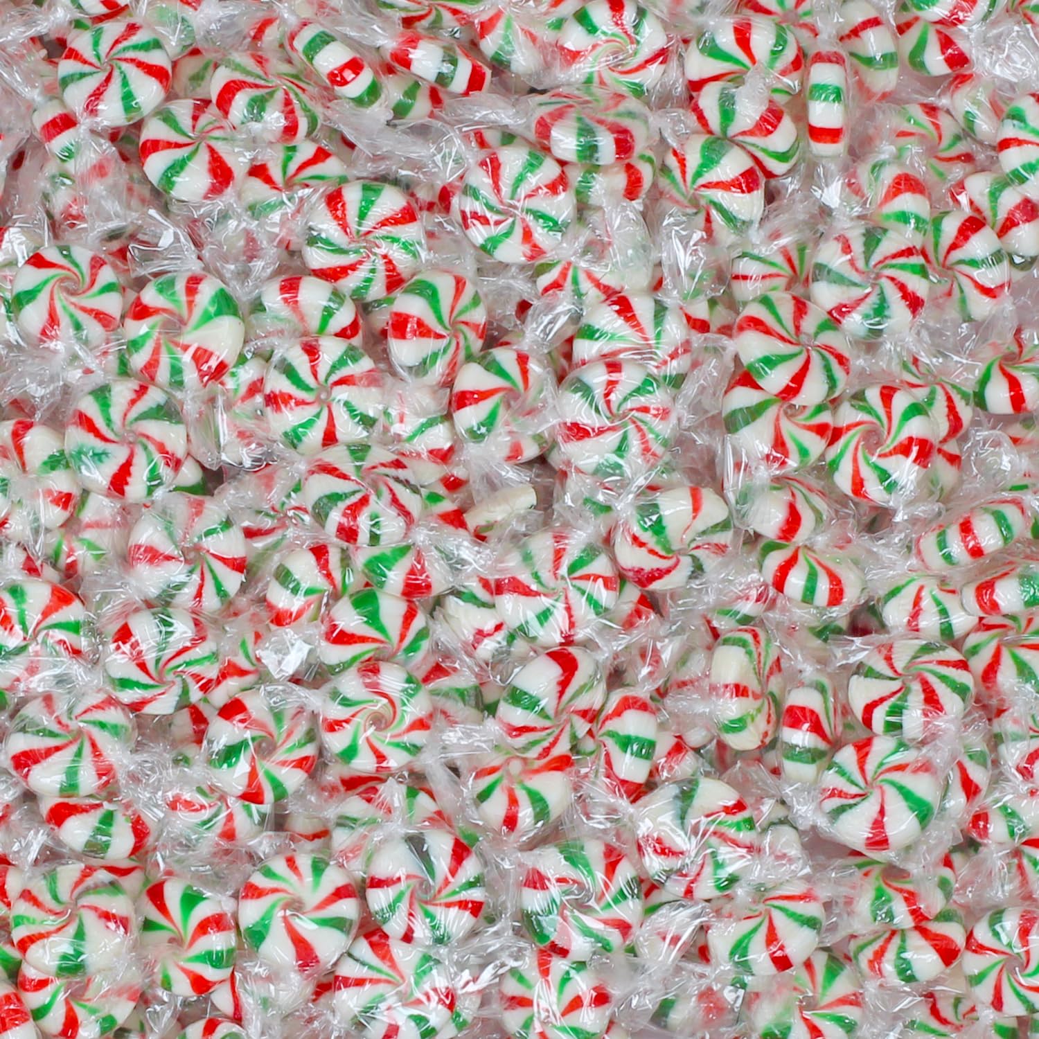 • These candies are individually wrapped and have a classic pinwheel design with red or green rays emitting from the white center.