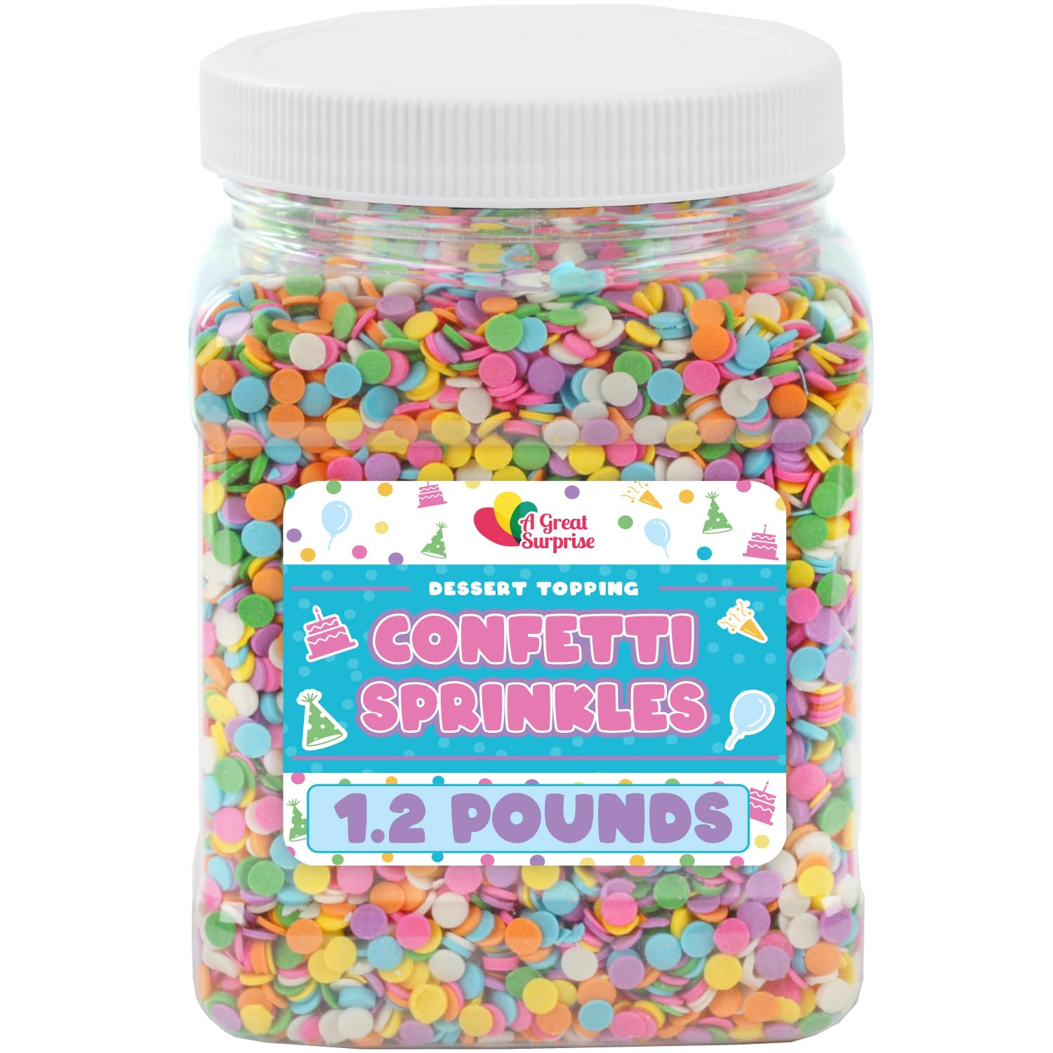 - Bulk Container: Confetti Sprinkles come in a bulk packaging of 1.2 Lb. Whether you're a professional baker or a home enthusiast, these sprinkles are the perfect addition to your cupcakes, cookies, ice cream or any dessert toppings.