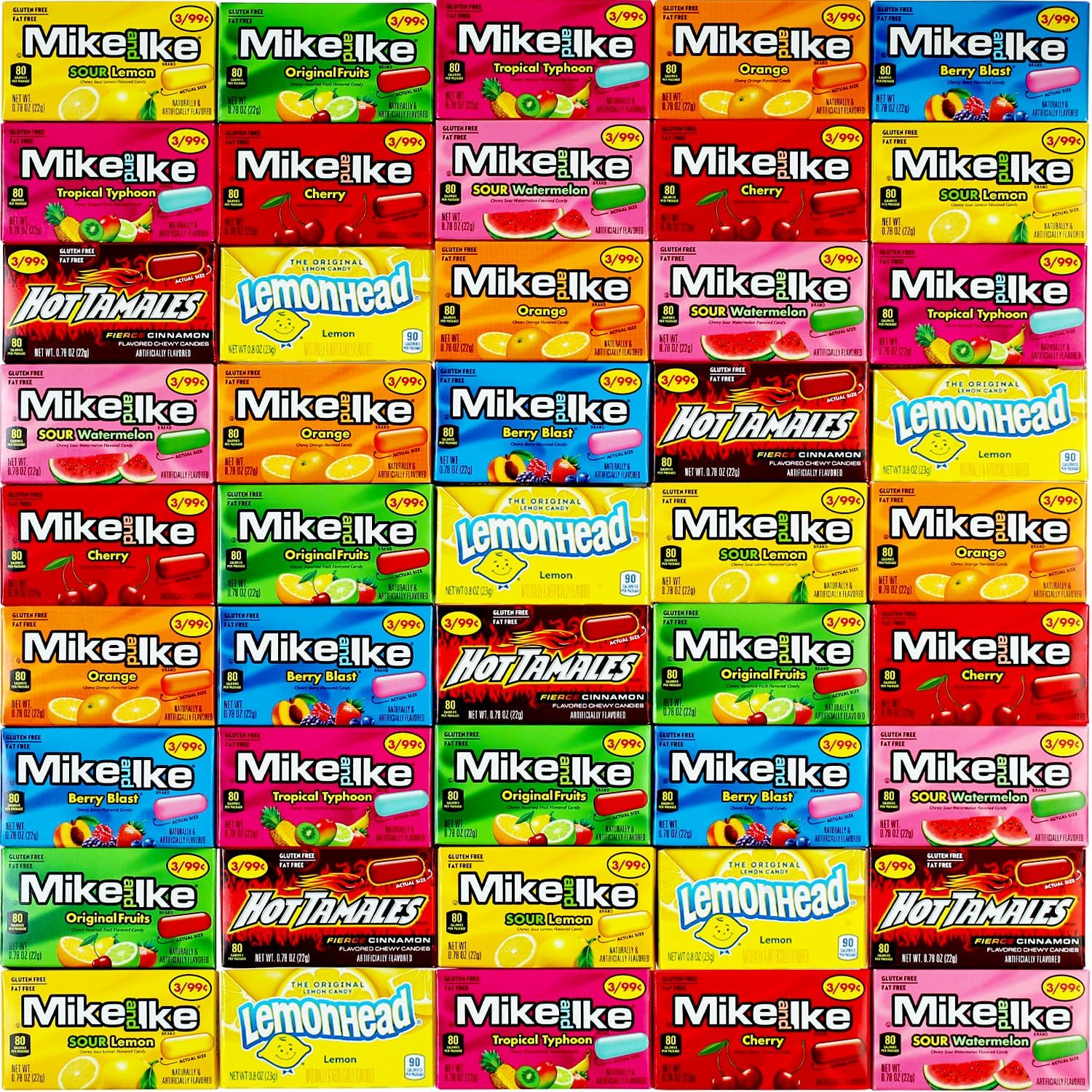 - Great mix of your favorite boxed movie candy all in one! ITEM IS A VARIETY AND MIGHT NOT INCLUDE ALL LISTED CANDY. Boston Baked Beans, Mike and Ike Tropical Typhoon, Mike and Ike Sour Watermelon, Mike and Ike Orange, Mike and Ike Berry Blast, Mike and Ike Original, Lemonhead Fruit Mix, Tropical Chewy Lemonhead, Red Hots and Lemonhead.