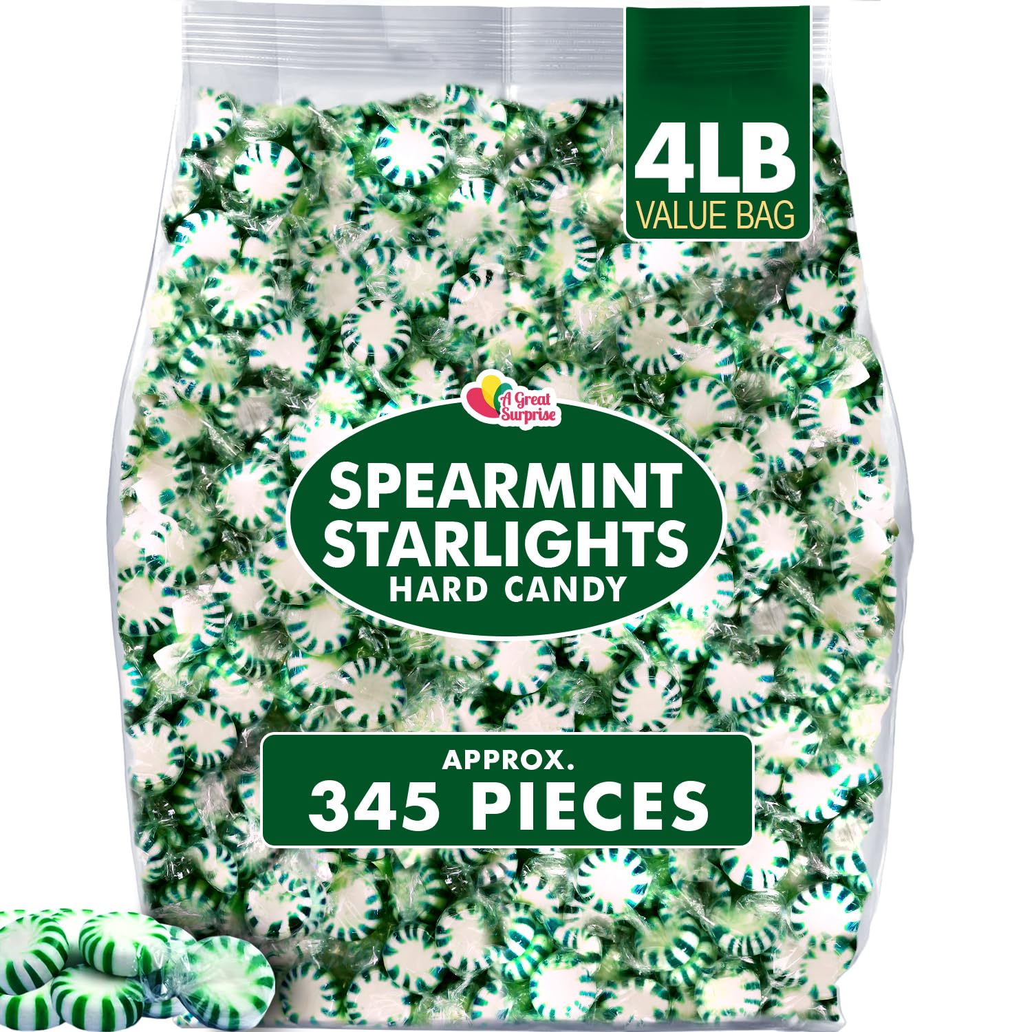 Spearmint Mints Starlight - 4 LB Bulk Hard Candies - Mint Candy - Green and White Mints - Individually Wrapped - Refreshing Candy Suckers